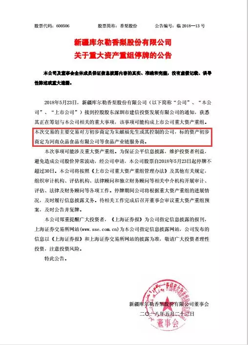 來(lái)源: 冷凍食品網(wǎng) 發(fā)布者:編輯5月23日晚,新疆庫(kù)爾勒香梨股份有限公司(簡(jiǎn)稱(chēng)“香梨股份”)公告稱(chēng)因籌劃收購(gòu)事項(xiàng)臨時(shí)停牌,收購(gòu)標(biāo)的初步確定為河南眾品食品有限公司(以下簡(jiǎn)稱(chēng)“眾品食品”)。