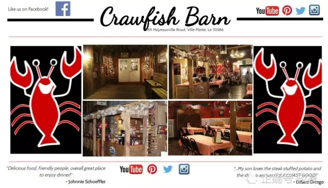 美國南方的路易斯安娜州人民也是小龍蝦愛好者,而且絕對不是網文中說的“小龍蝦已經從他們的餐桌上逐漸消失”,路易斯安娜不少以小龍蝦作為招牌菜的餐館現在生意都紅火著呢, 像“小龍蝦大倉”(Crawfish Barn)這樣的店甚至還有自己的專屬網站,誰說不吃小龍蝦,餐館老板第一個拎起炒勺跟他急信不信?