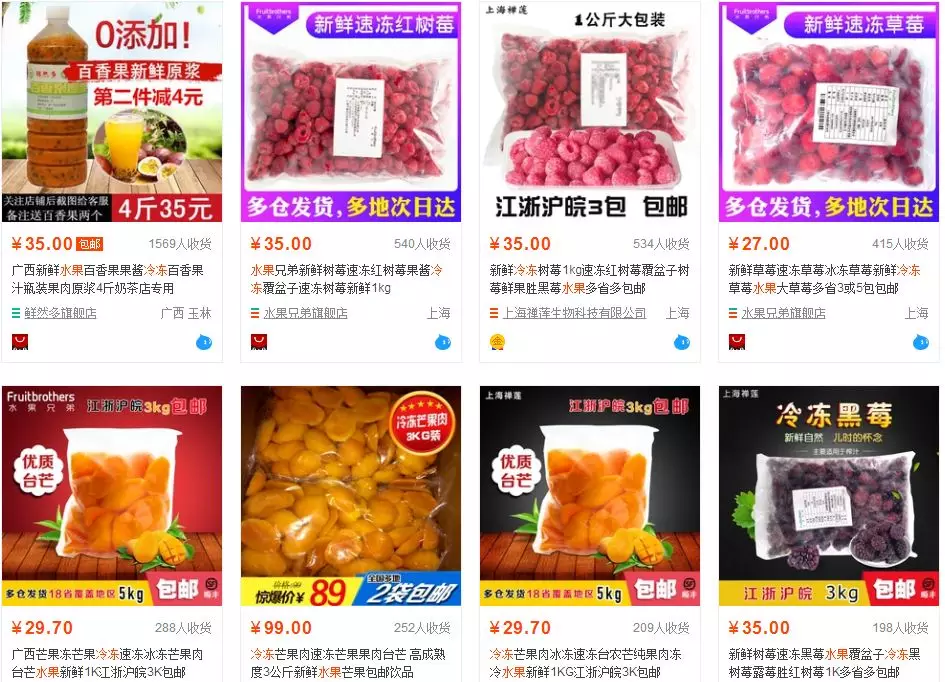 在淘寶、阿里巴巴等平臺搜索“冷凍水果”,數百條產品信息讓人眼花繚亂:冷凍芒果、草莓、樹莓、黃桃、無花果等等,各色產品種類繁多,儼然已經成為一個小熱門品類。淘寶上銷量最高的冷凍水果,交易量達2300多筆,累計評論2100多條,產品收藏數最高超過1.3萬。