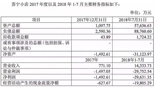 從其公告中披露出的最新業(yè)績來看,該筆增資對蘇寧小店十分重要。數(shù)據(jù)顯示,蘇寧小店2018年1至7月營收1.43億元,虧損2.96億元,債務(wù)高達(dá)6.53億元。股權(quán)轉(zhuǎn)讓的前提,即蘇寧易購清理掉此債務(wù)。此次將蘇寧小店業(yè)務(wù)剝離出上市公司,也是防止未來蘇寧小店擴張造成的虧損影響到上市公司的業(yè)績。