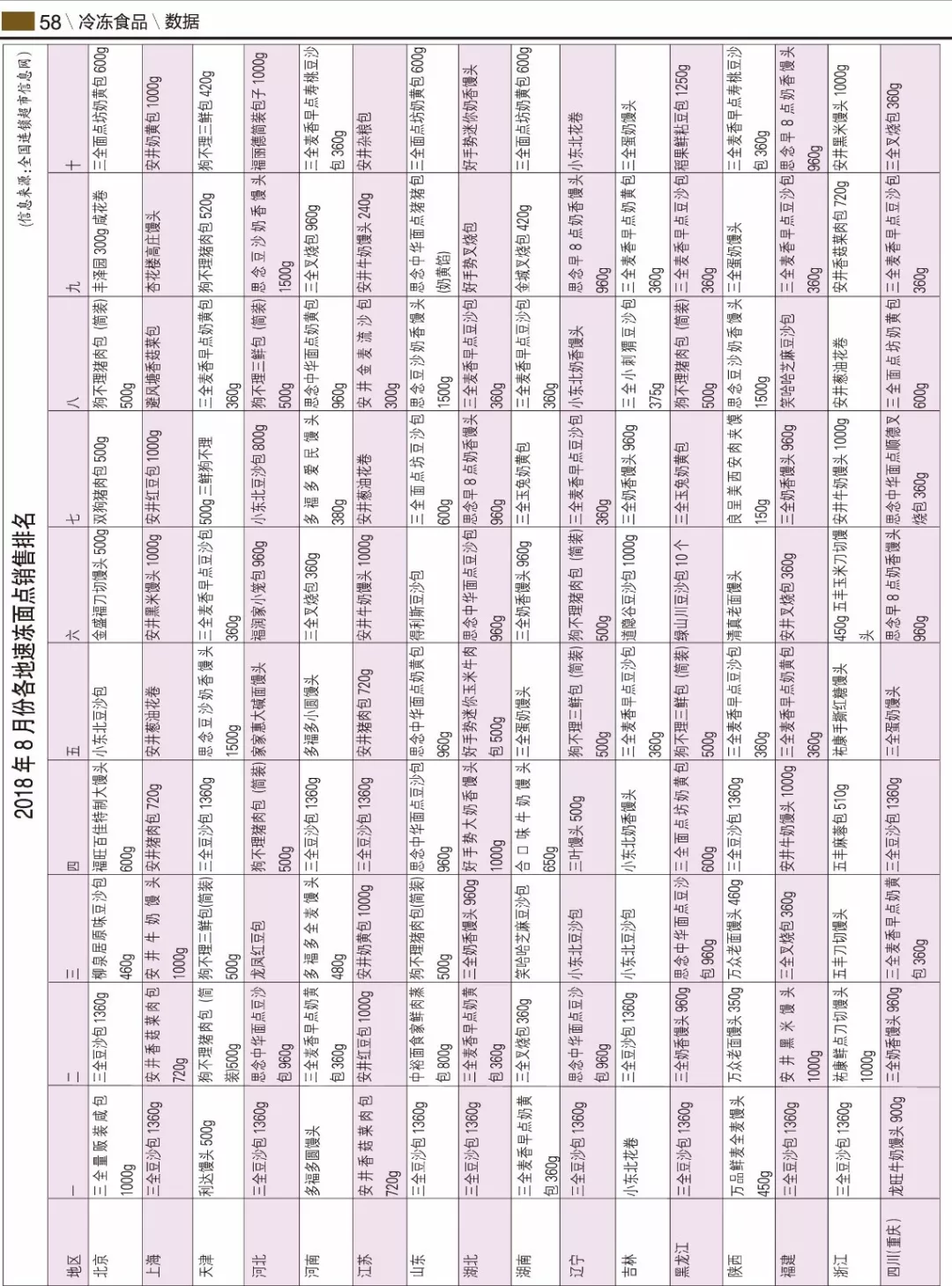 ▼2018年8月份各地速凍面點銷售排名