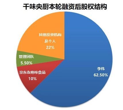 本次融資完成后,千味央廚實(shí)際控制人李偉持股62.5%,京東和絕味食品合計(jì)持股10%,管理團(tuán)隊(duì)占比5.5%,其他投資機(jī)構(gòu)和個(gè)人占比22%。