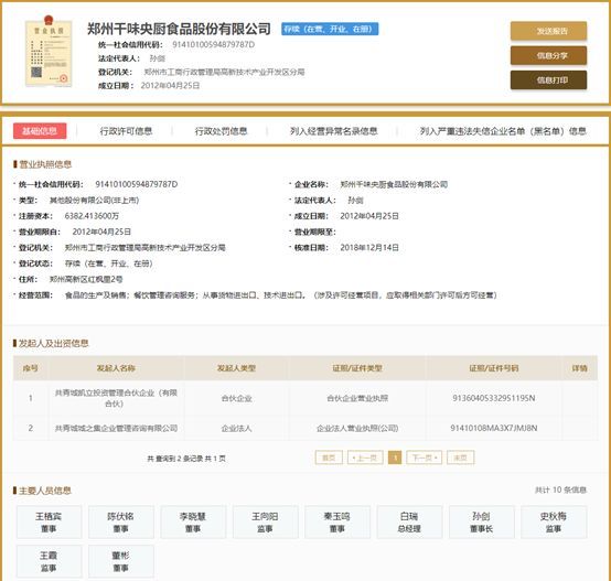 工商登記信息顯示,鄭州千味央廚食品股份有限公司于2012年4月25日注冊(cè)成立,注冊(cè)資本6382萬(wàn)元,由共青城凱立投資管理合伙企業(yè)(有限合伙)和共青城城之集企業(yè)管理咨詢有限公司共同出資。