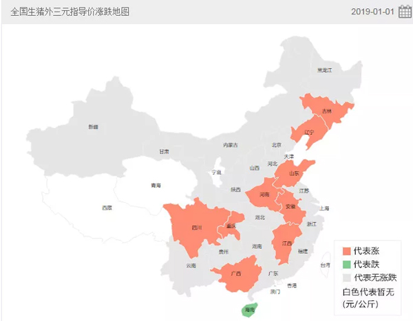 △豬e網統計的2019年1月1日全國生豬外三元指導價漲跌地圖