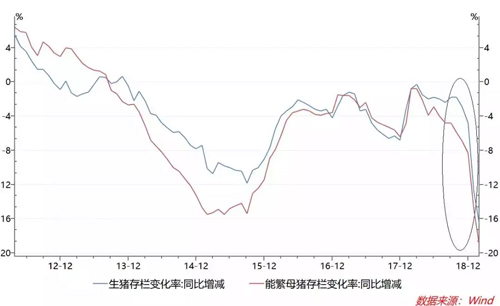 由于豬肉消費量大且相對穩定,豬價主要受生豬供給的變化影響。2018年三季度以來發生的相關疫情,導致生豬及能繁母豬存欄數量銳減。隨著供給大幅下滑,豬價上漲變得順理成章。