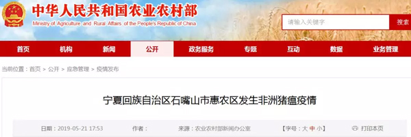 農(nóng)業(yè)農(nóng)村部新聞辦公室5月21日17時53分發(fā)布,寧夏回族自治區(qū)石嘴山市惠農(nóng)區(qū)發(fā)生非洲豬瘟疫情。