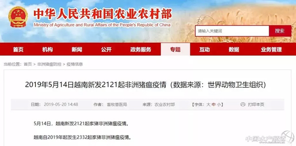 據(jù)世界動物衛(wèi)生組織消息,5月14日,越南新發(fā)2121起家豬非洲豬瘟疫情。越南自2019年起發(fā)生2332起家豬非洲豬瘟疫情。
