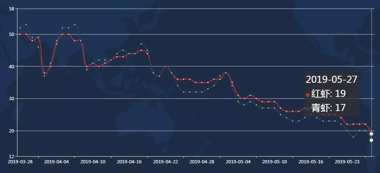 圈內外人都知道,近期,小龍蝦上游價格一直下跌。湖北潛江最大的小龍蝦交易市場平臺——“蝦谷360”的價格監測圖顯示,6-8錢的紅小龍蝦批發價格,在4月18日為45元左右,至5月27日已經跌至19元。