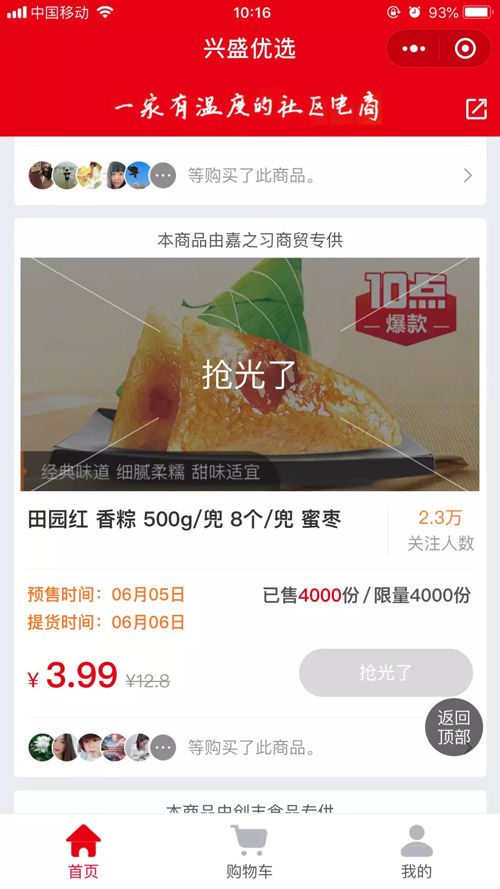 昨天上午,興盛優(yōu)選推出一款500克的田園紅香粽,售價3.99元。10點(diǎn)開賣,僅僅2分鐘就賣出4000份,共1108人參與購買。