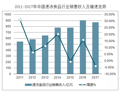 有統計數據顯示,中國速凍食品行業規模從2004年的45.66億元增至2013年的648.81億元,年復合增長率達到30.42%,此后幾年增速放緩,2017年甚至負增長。