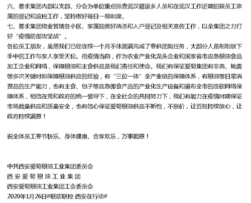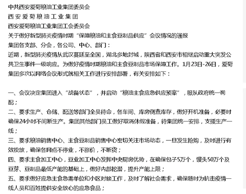 五得利公眾號(hào)也發(fā)文:考慮到當(dāng)前出現(xiàn)的物資供應(yīng)不足的苗頭,五得利面粉集團(tuán)董事會(huì)領(lǐng)導(dǎo)及員工提前停止休假,15個(gè)子公司部分重要崗位員工已于正月初三返廠,應(yīng)對(duì)全國(guó)人民對(duì)面粉的需求,為保障全國(guó)市場(chǎng)面粉供應(yīng)做好準(zhǔn)備,五得利面粉集團(tuán)將竭盡全力,勇于擔(dān)當(dāng),全力以赴,保障人民群眾對(duì)面粉的需求!