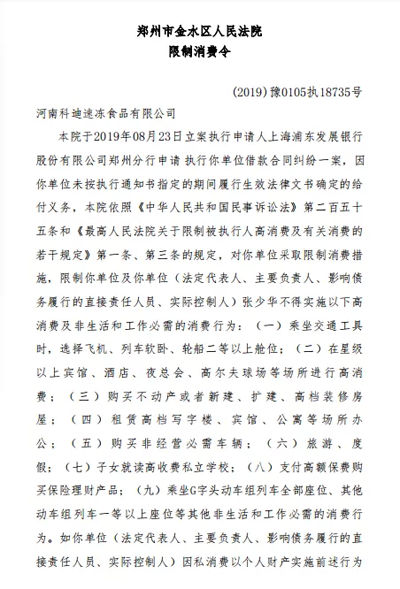 據企查查網站顯示,4月1日,科迪速凍被鄭州市金水區人民法院列為失信被執行人,并對其發布了《限制高消費》。不僅如此,2019年7月4日,科迪速凍還曾被鄭州新高技術產業開發區人民法院列為失信被執行人。
