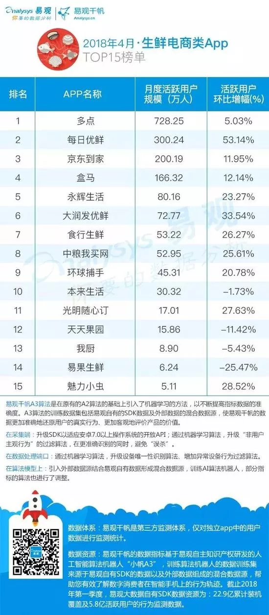 來源: 冷凍食品網 發布者:編輯近日,易觀發布的2018年最新生鮮電商APP TOP15榜單顯示,多點以728.25萬活躍用戶規模依舊占據榜首,每日優鮮以300.24萬活躍用戶規模位居第二,京東到家以200.19萬活躍用戶位居第三。
