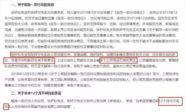 公告表示,張軒松和張軒寧在公司發(fā)展方向、發(fā)展戰(zhàn)略、組織架構(gòu)、治理機制等方面存在較大分歧,對永輝云創(chuàng)(超級物種)的定位、發(fā)展方向和路徑也有不同意見。為避免分歧進(jìn)一步加劇,影響上市公司及全體股東利益,張軒松先生和張軒寧先生正式簽署《關(guān)于解除一致行動的協(xié)議》。
