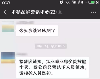 “9月底公司開會時通知10月份放假10天,到10月11日上班后,公司稱暫不上班繼續等通知;14日又接通知稱整個集團放假10天,25日又讓繼續等通知。我們都是按公司通知放假的,但原品鮮公司人資部門負責人說10月份沒去上班就沒有工資。”余某說。