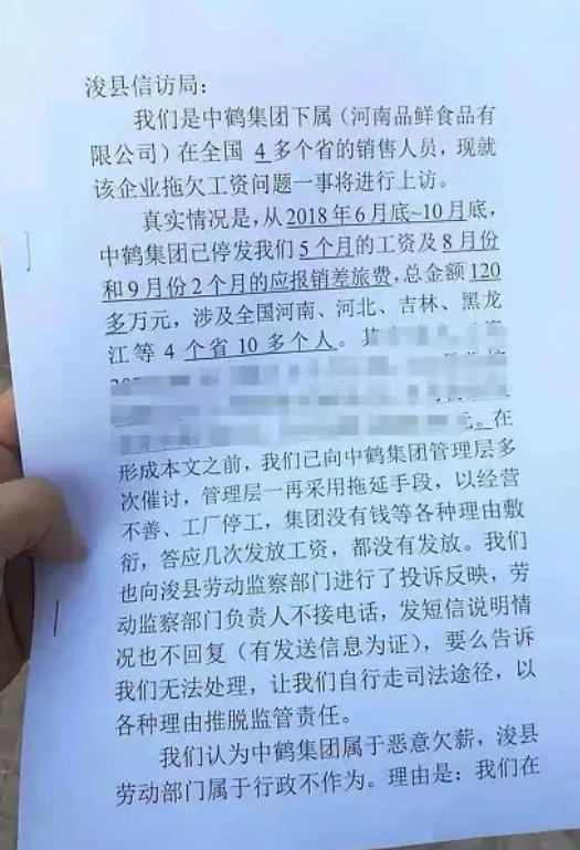 近日,原河南中鶴品鮮食品有限公司(簡稱“中鶴品鮮”)多位員工致電冷食傳媒記者,稱已經好幾個月沒發工資,應報的差旅費也沒報銷,且與中鶴集團交涉多次未果。