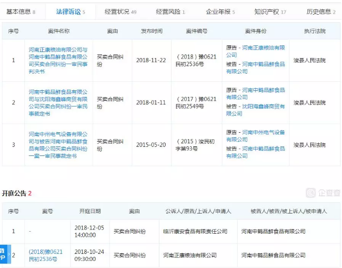 另一條原告臨沂康安食品有限責任公司與被告河南中鶴品鮮食品有限公司的買賣合同糾紛,該案件的開庭日期是12月5日14點,截至記者發稿前,未在企查查上看到判決結果。