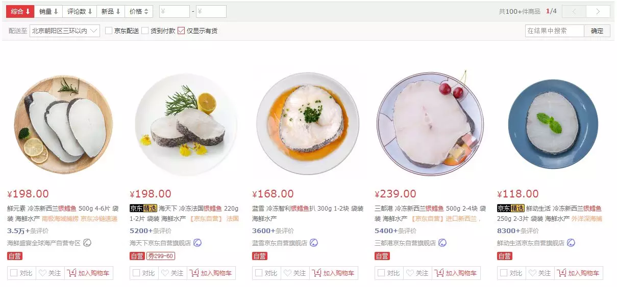 京東生鮮搜索“銀鱈魚”,共有200多件商品供選擇