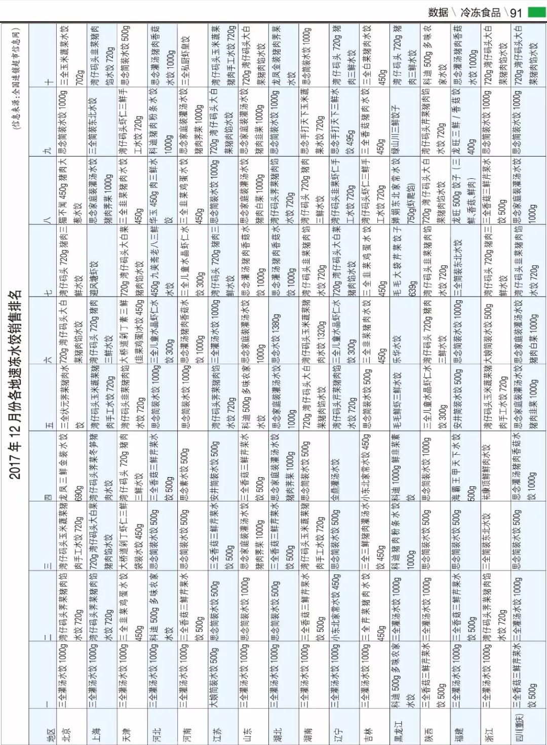 ▼2017年12月份各地速凍水餃銷售排名
